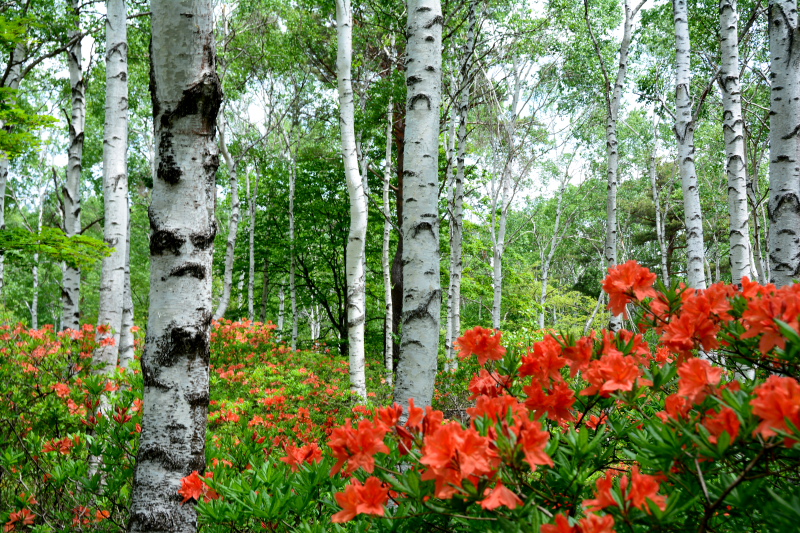 白樺の林に橙色のレンゲつつじが何とも言えない