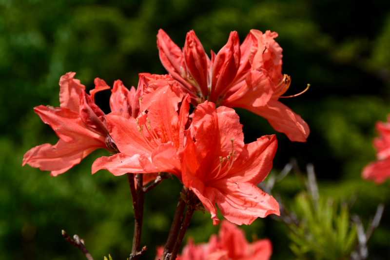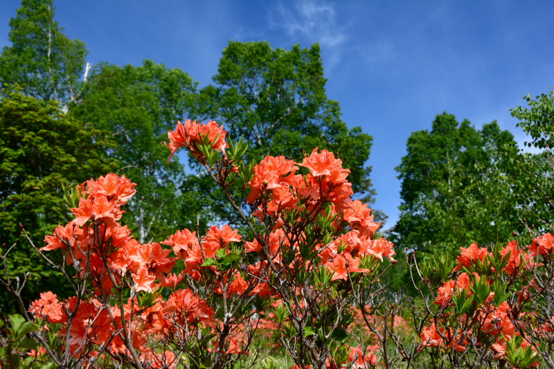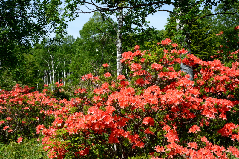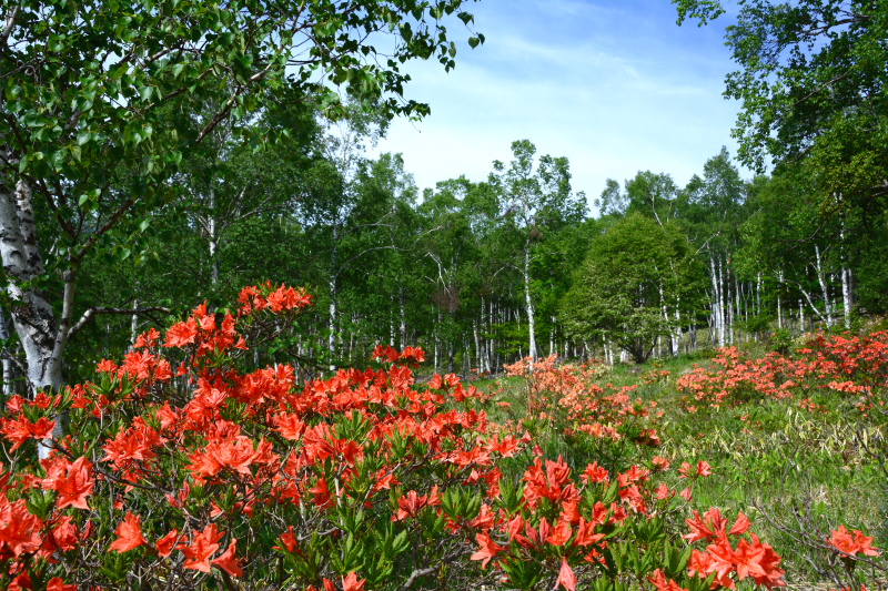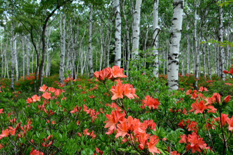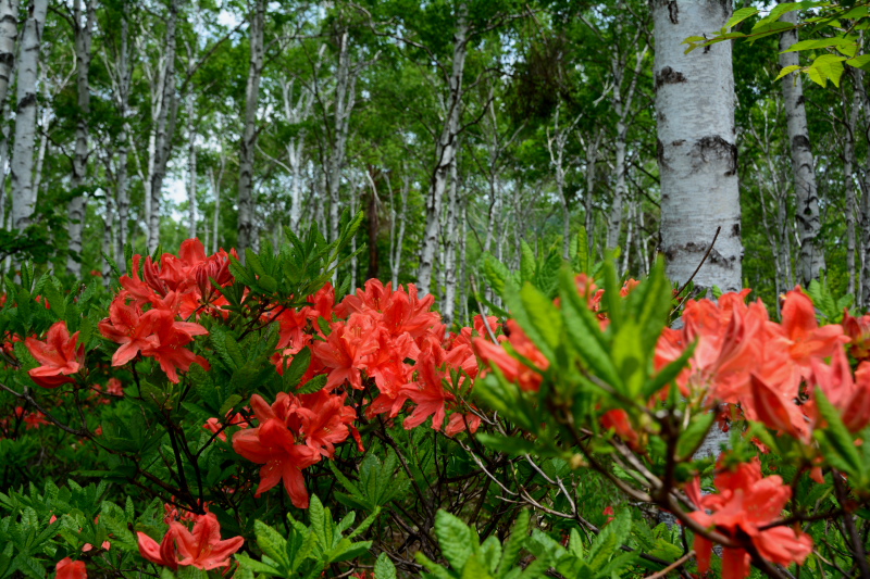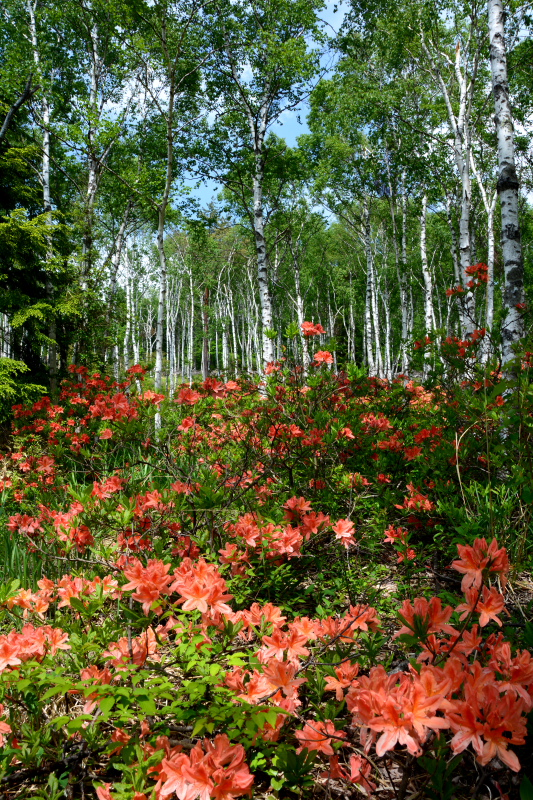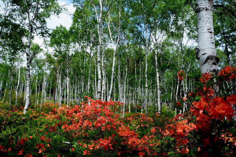 白樺の林に橙色のレンゲつつじが何とも言えない