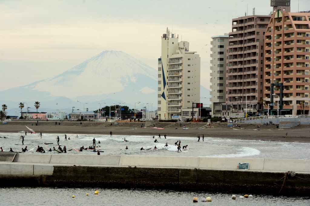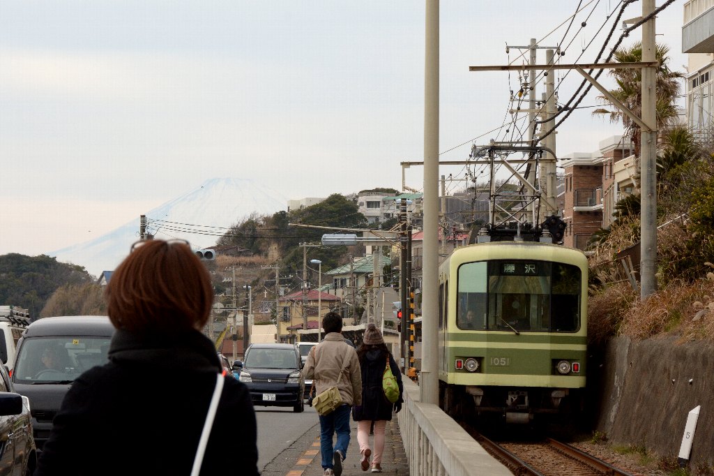 沿線を歩きながら電車と富士山や江ノ島を撮影し、