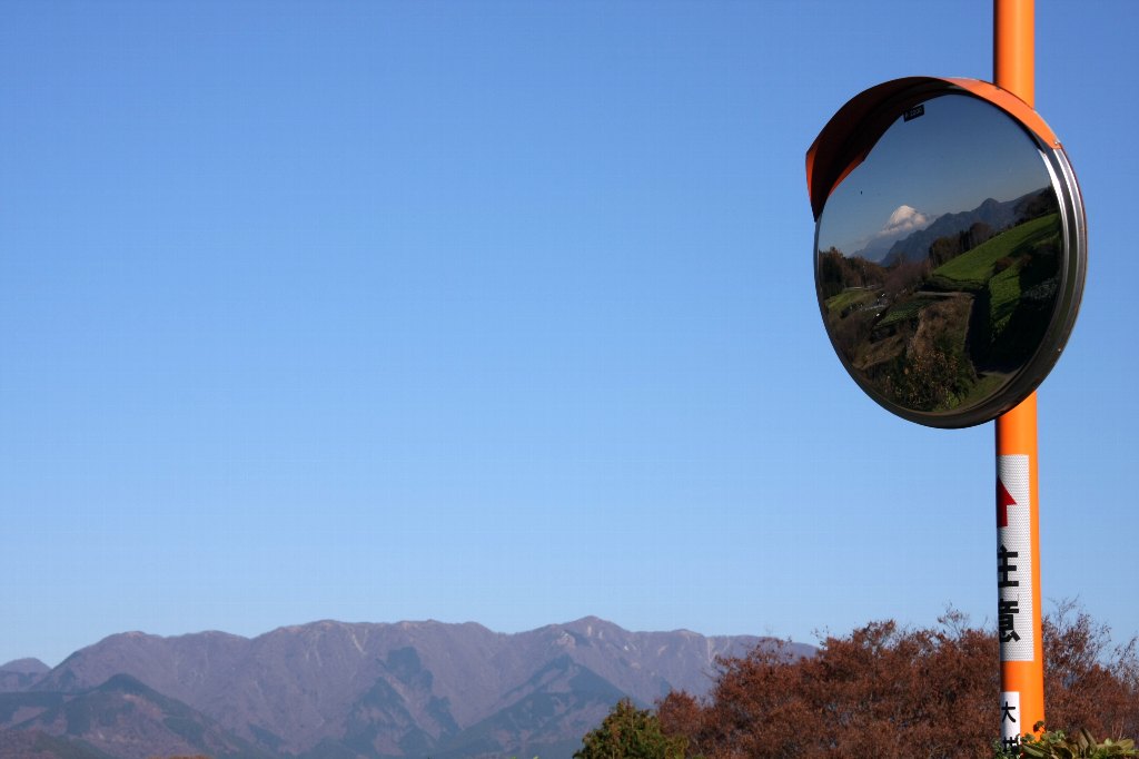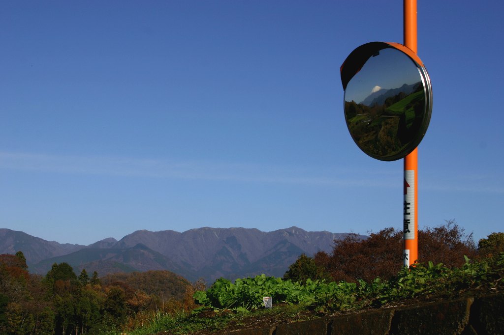 丹沢山塊とカーブミラーに写る富士山