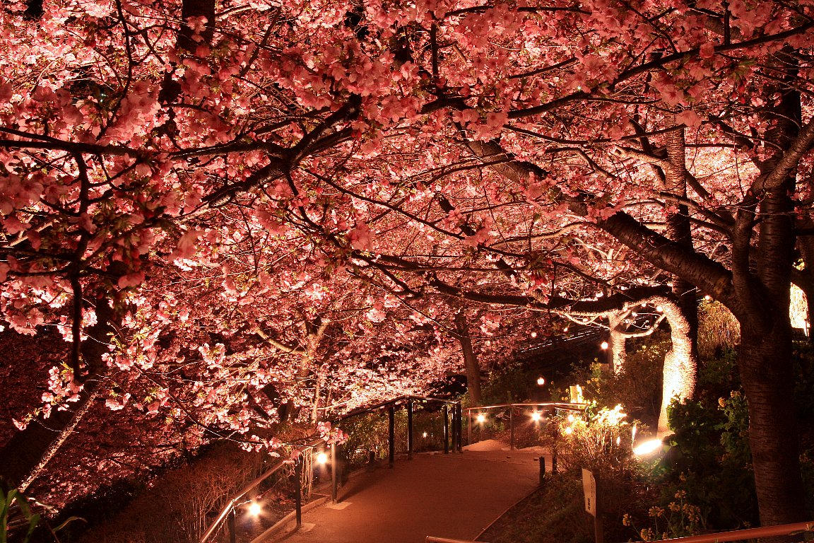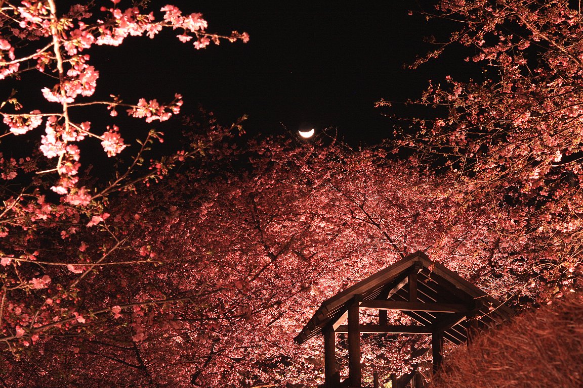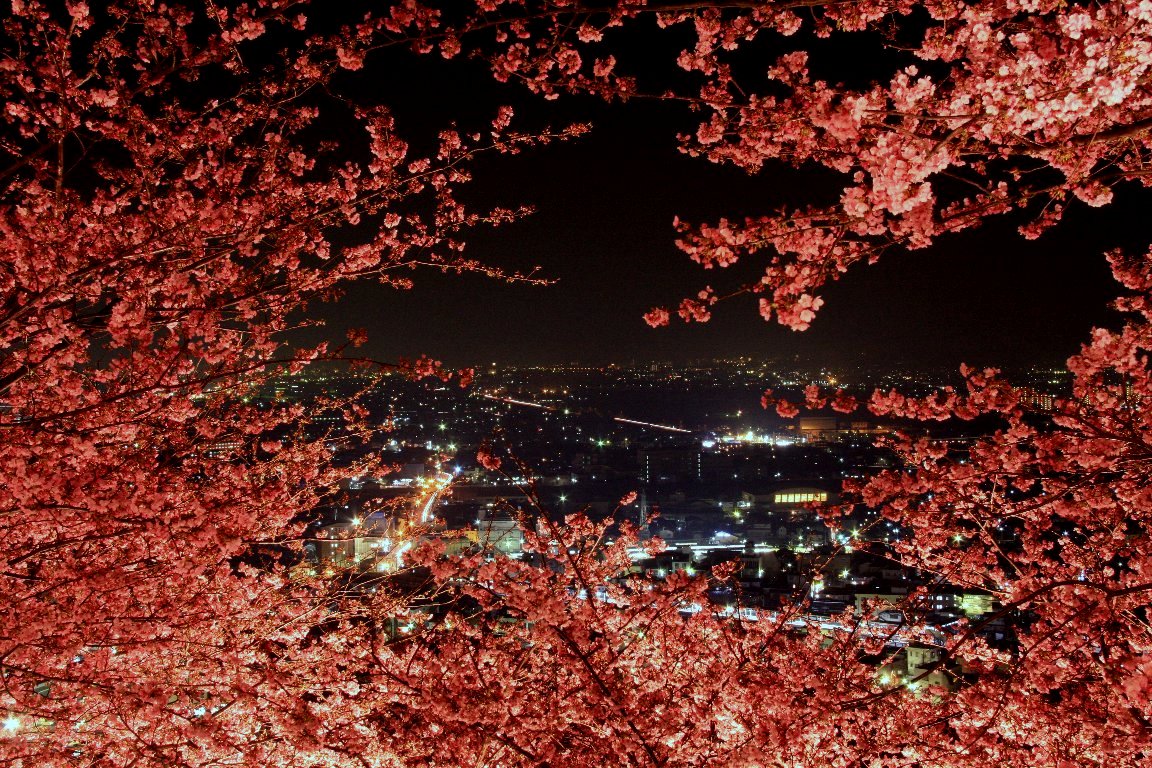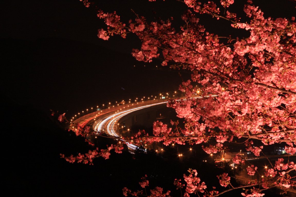 昼間の感じと違い、桜の間から見る松田町、開成町、